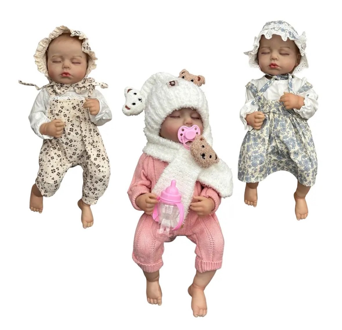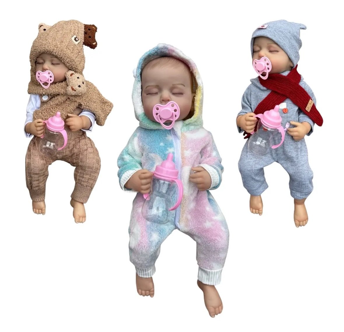 Viene en 6 diferentes vestimentas y todos los bebes incluyen: Pañal, Tete, Biberon, Tarjeta de Nacimiento.