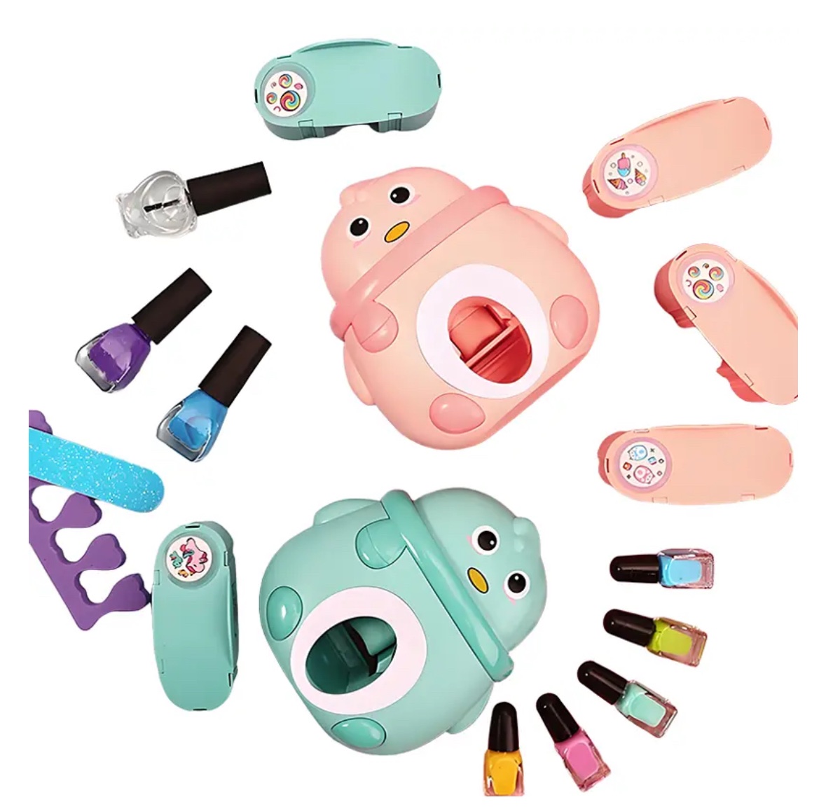 Incluye paleta de sombra para ojos, brillo de labios, separador de dedos y esmalte de uñas
