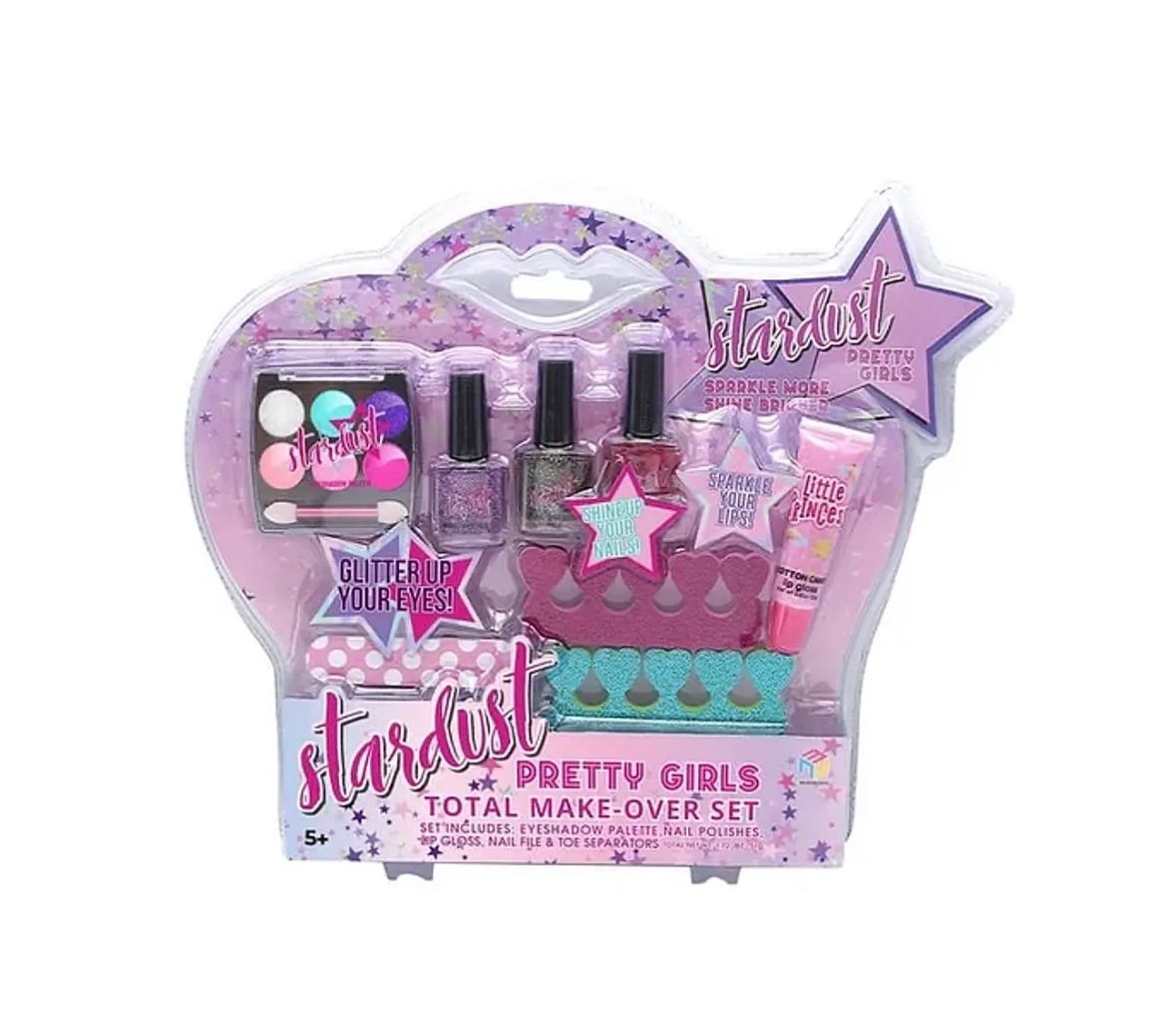 Incluye paleta de sombra para ojos, brillo de labios, separador de dedos y esmalte de uñas